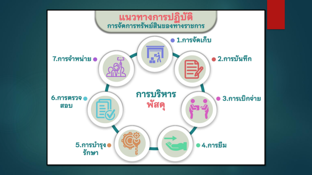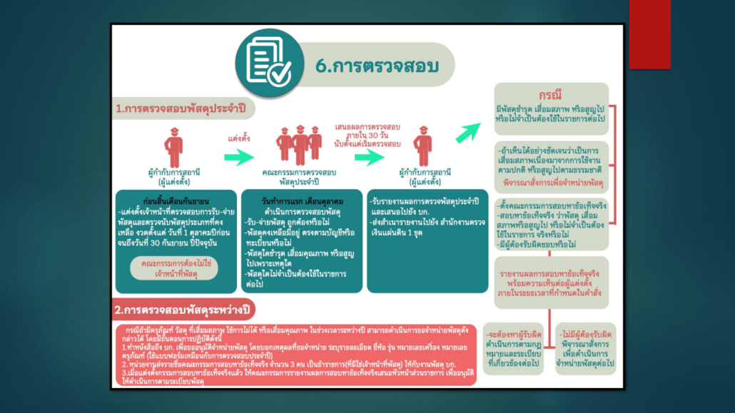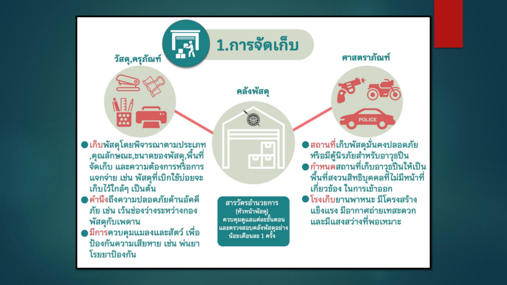 กำหนดแนวทางควบคุม กำกับดูแลรักษา ตรวจนับ ตรวจสอบสภาพการใช้งานทรัพย์สินของราชการ ของบริจาคโดยเฉพาะทรัพย์ประเภทที่มีความเสี่ยงในการนำไปใช้โดยมิชอบ
